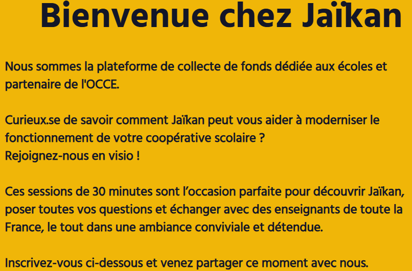 Curieux de découvrir Jaïkan, la plateforme partenaire de l’OCCE 45 qui modernise les collectes de fonds des coopératives scolaires et fait gagner du temps et de la tranquillité d’esprit ?